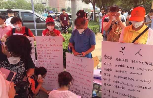 Relatives of Tianjin residents missing after the blasts hold up information about their loved ones. At the Vantone Central Park – which is around 2km from the scene of the disaster – signs of the blast were everywhere.